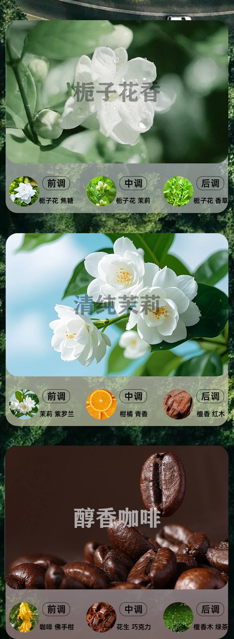 সুগন্ধি: গুলং, মহাসাগর, গার্ডেনিয়া, জেসমিন, কফি